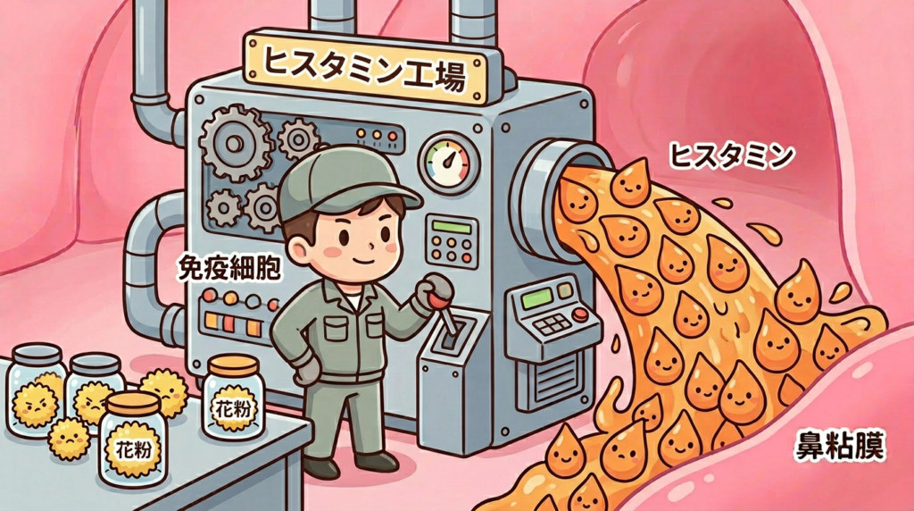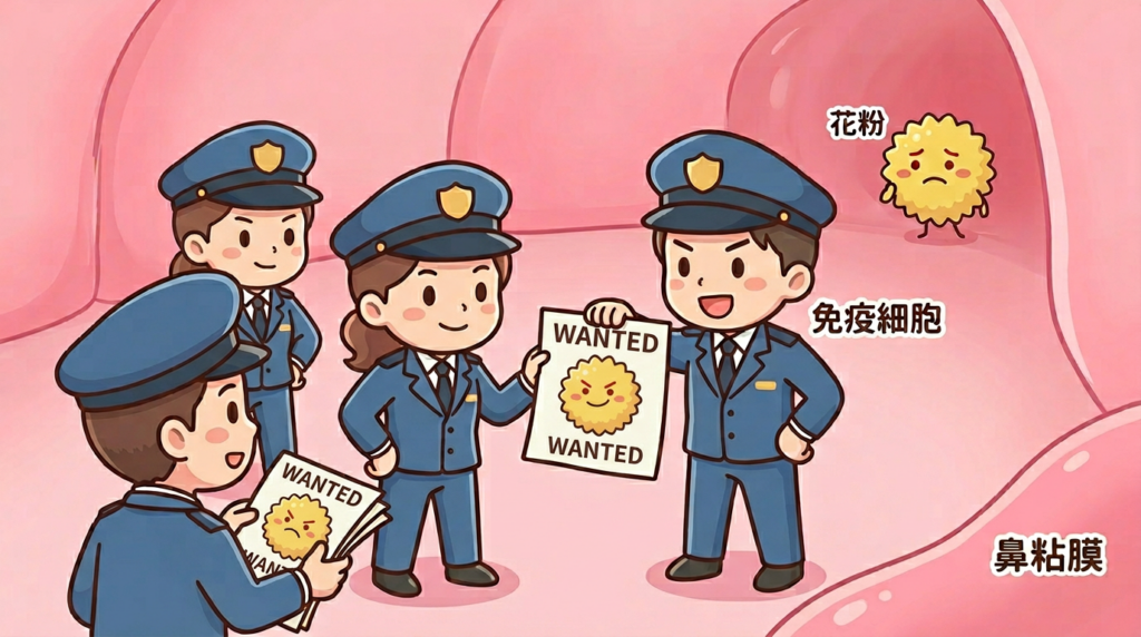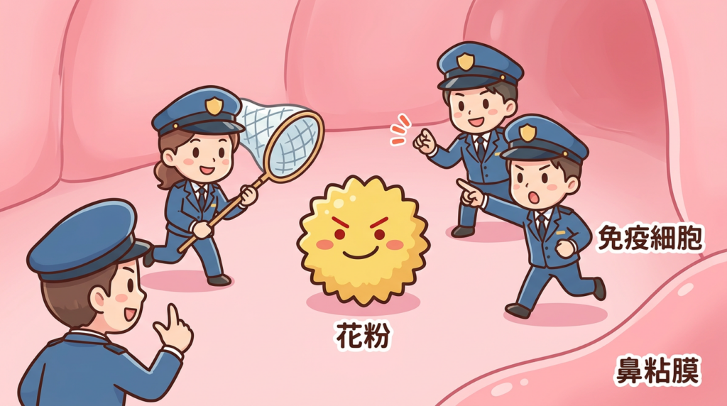 免疫細胞が花粉を敵だと思って反応していますね。