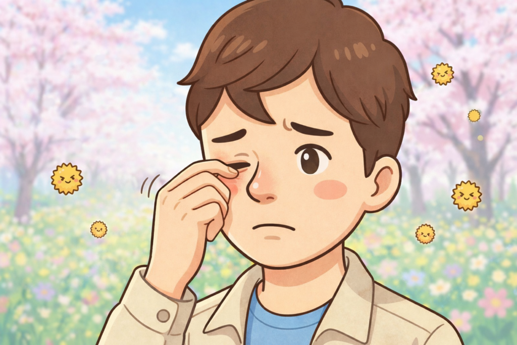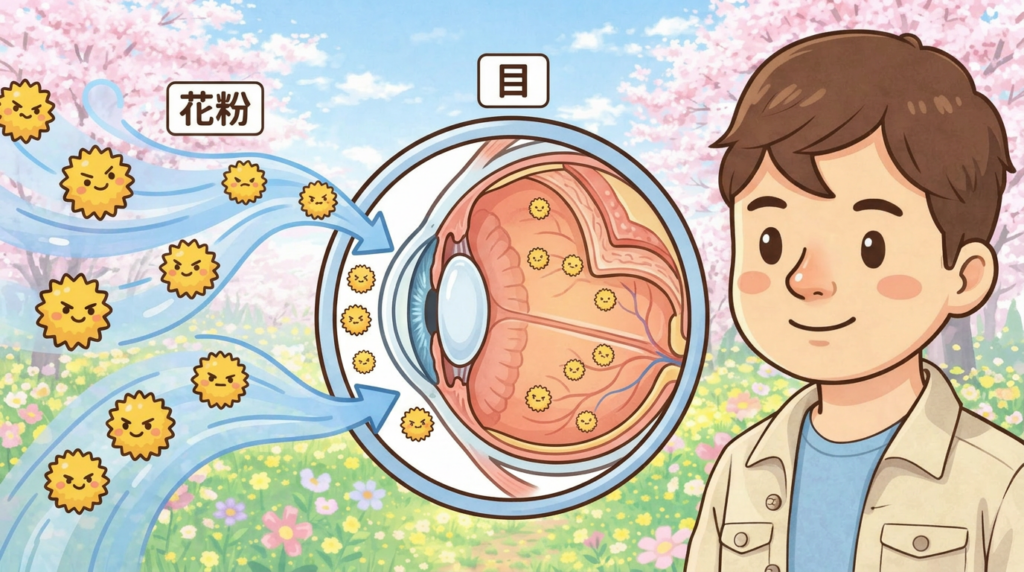 これから花粉症で目の痒みが出る仕組みを、イラストで分かりやすく解説しますね。