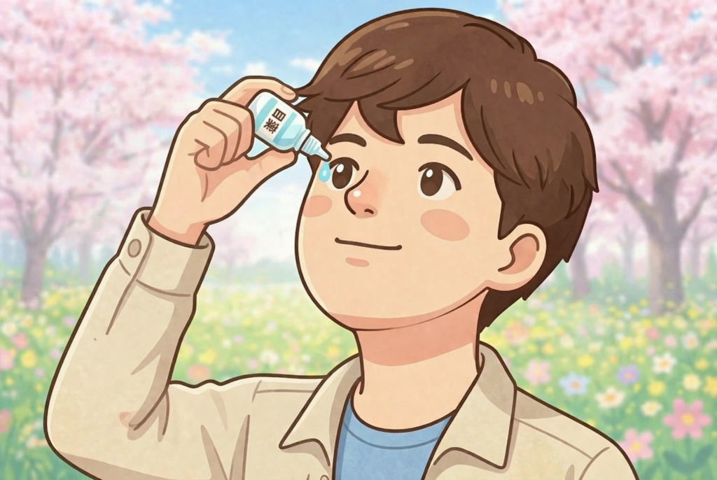 痒みの目薬をさしていますね。
