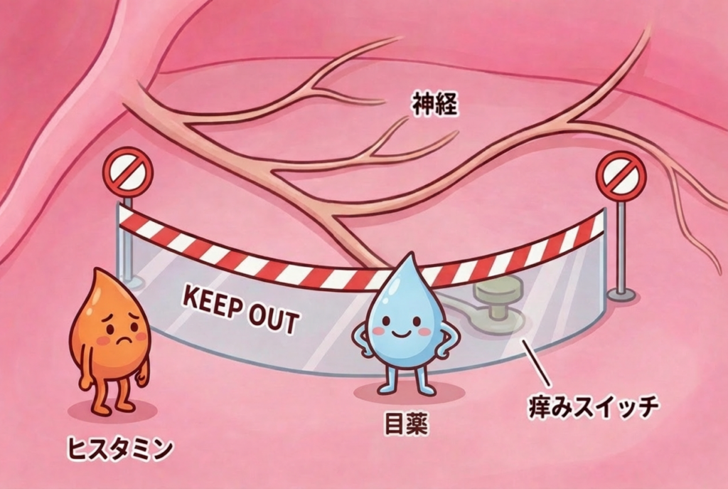 目のかゆみを抑える薬の仕組みを、できるだけ分かりやすく説明します。